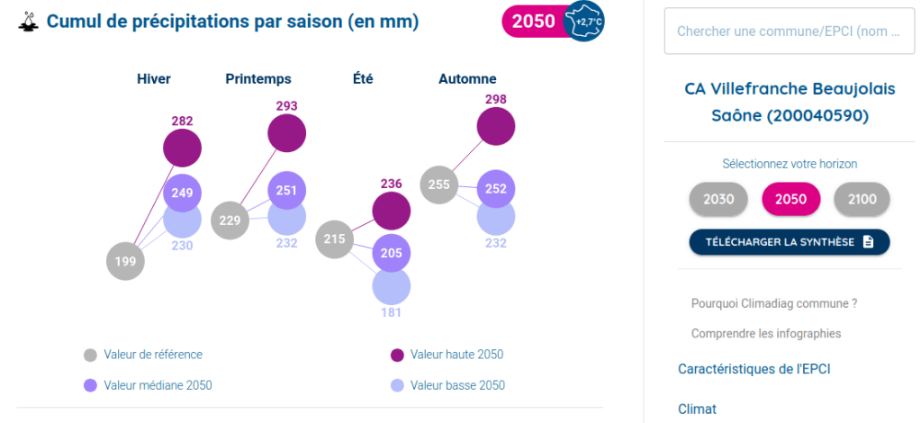 * Pourtant dans ce document météoFrance4 pour l’Agglo-Villefranche ci-contre, des prévisions hautes de précipitations printanières et automnales 2050 cumulées atteignent près de 300 mm.