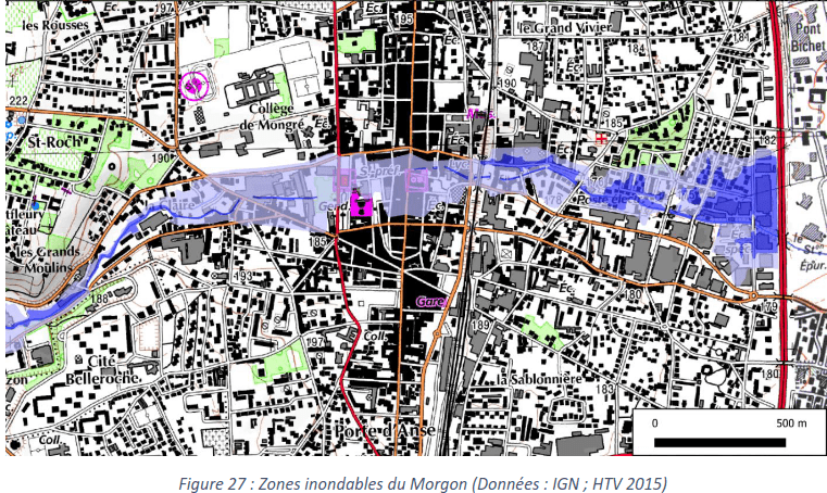 « Sur le Morgon, les écoulements débordants dans le centre-ville de Villefranche-sur-Saône ont été caractérisés à l’aide d’un modèle à 2 dimensions (module 2D du logiciel HEC RAS) afin de mieux identifier les écoulements sur les voiries. » Tel est évoqué page 41 de la Note de Présentation, la question du passage souterrain du Morgon.