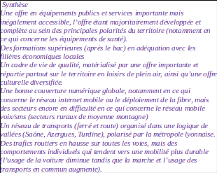 La synthèse résume en creux les évolutions : * concentrations et réductions des services = campagnes abandonnées (santé, éducation, …) * formations supérieures limitées (départ des jeunes) * mobilité polarisée par Lyon d’où trafics ferrés ou routiers pendulaires accrus (soutenus par le SCOT précédent : trafic autoroute en forte hausse – A89 – + vallée Azergues) * Le tourisme (vin, rando, musée) est en expansion.