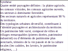* mêmes concentrations des emplois dans quelques grosses polarités de la Saône, des « projets structurants » en cours qui se trouvent entièrement sur ces secteurs – et 1 au bord de l’A89) (avec artificialisation forte). La quasi mono-culture de la vigne (68 % des exploitations sur 30 % de la SAU – en baisse ), la dépendance alimentaire du territoire très importante (céréales légumineuses, fruits et légumes, …), la chute de 25 % du nombre d’exploitation agricole entre 2010 et 2020.
