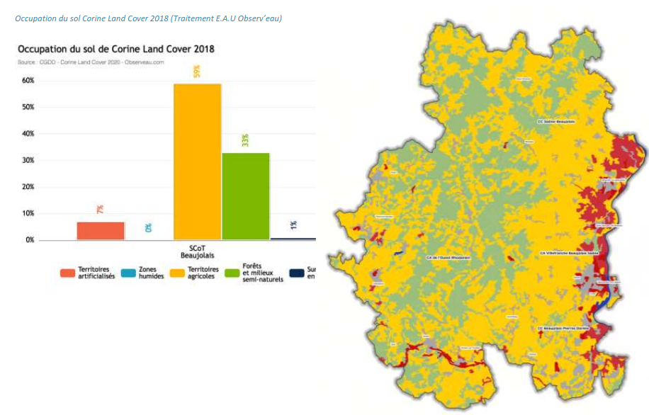 *Espaces naturels à préserver :16 % du territoire, forêt 33 % (avec Stratégie Forêt Bois du Beaujolais), espaces fonctionnels – zones géographiques où les interactions entre les différentes fonctions (résidentielles, commerciales, industrielles, etc.) sont optimisées pour favoriser un développement durable : 33 %.
